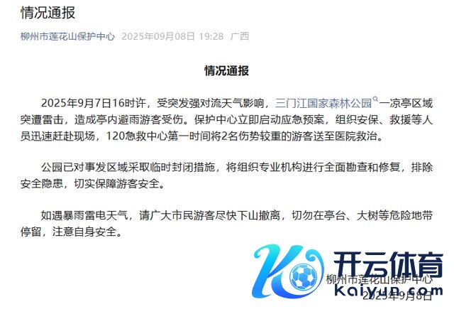 九游体育娱乐网 据王人鲁晚报音书:9月8日,有广西柳州网友爆料称,7日下昼,柳州三门江国度丛林公园有东谈主遭雷击。视频炫耀,疑似在一凉亭下有东谈主倒地,医务东谈主员正在开展调停。 9月8日,柳州市莲花山保护中心发布情况通报: 2025年9月7日16时许,受突发强对流天气影响,三门江国度丛林公园一凉亭区域突遭雷击,酿成亭内避雨搭客受伤。保护中心立即运行济急预案,组织安保、调停等东谈主员连忙前往现场,120急救中心第一时辰将2名伤势较重的搭客送至病院救治。公园已对事发区域接纳临时顽固递次,将组织专
